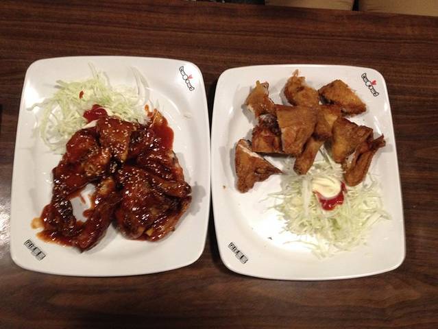 韩国到处都能找到炸鸡店。这个炸鸡分两种口味一个比较像m记,另一种有点像糖醋的做法,都很好吃。难怪女神喜欢炸鸡配啤酒啦。