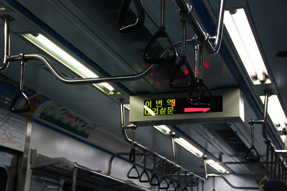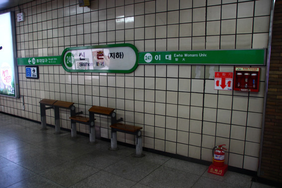 图就是新村啦,下站就是梨大。如果是要坐地铁的亲一定要准备一份韩文地图和一份中文地图。因为首尔的地铁很奇葩的。没有一个地铁站长的一样!没有一趟列车长的一样!所以有的列车里有中文提醒,有的没有,所以还是多准备一份韩文的有备无患吧。另外还要提醒千万不要坐老弱病残的座位,会被鄙视的。老弱病残的专区每趟车长的也不一样,小心不要做错,我们几个就悲剧了……