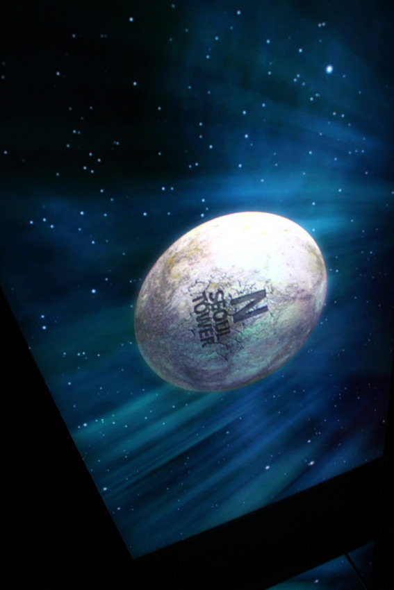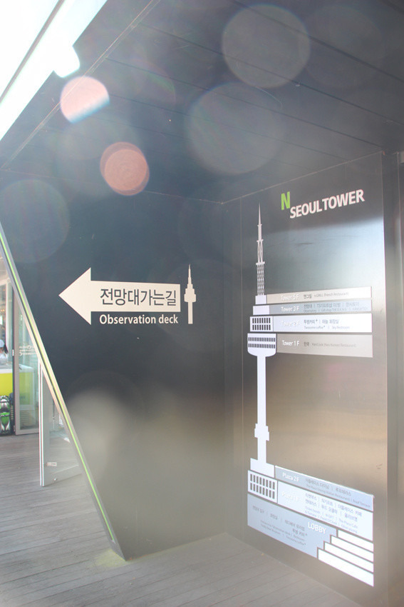 我们先是坐电梯参观首尔塔。我很喜欢这个电梯的天花板。天花板是led屏幕的。从地面向塔顶进发时会呈现从地球逐渐冲出大气层进入太空到画面,回来时则呈现相反到画面,很有趣。