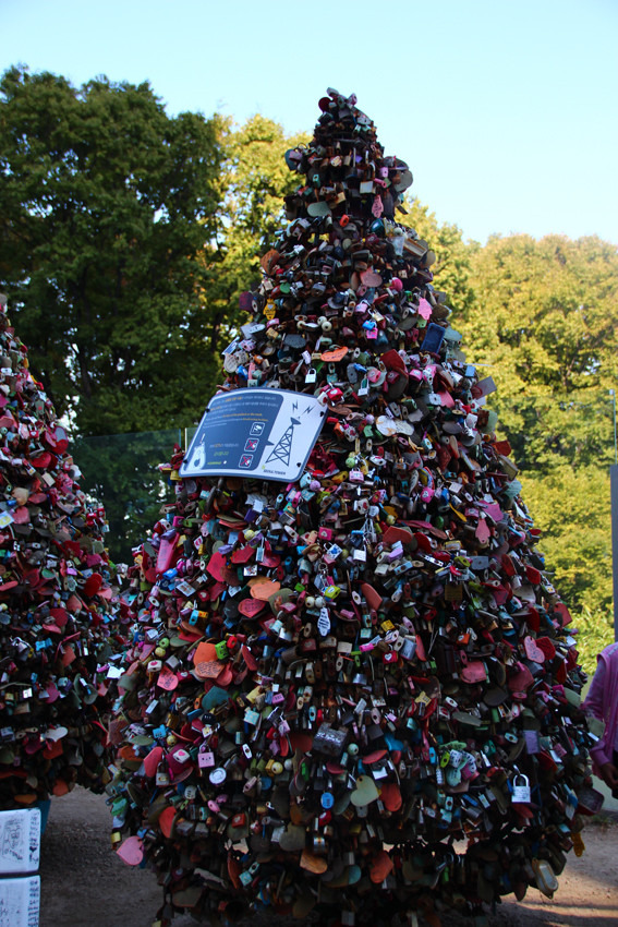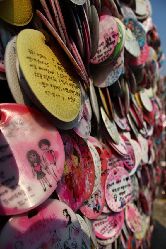 我们去的那天天气很好,能见度很高,所以我们拍了不少鸟瞰图。塔顶的空间很大,有休息区和一些纪念品小店,个人认为韩国到纪念品做到质量还是不错的。从首尔塔下来就可以看到很多有许愿锁构成的小树。刚看过《星星》的亲们一定不陌生,可惜去的时候教授他们还木有把锁拴上呢。