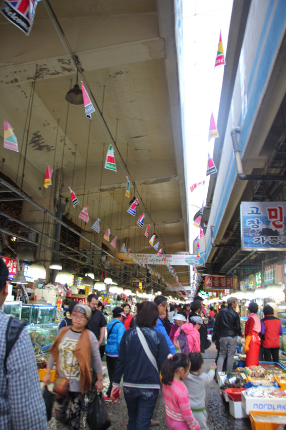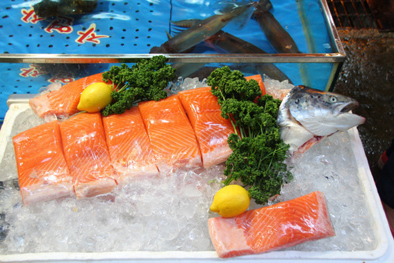 很快我们就顺利到达水产市场了。这里有上下两层,一层是卖海鲜的店铺,楼上则可以烹饪顾客从一楼购买到海鲜,只要付加工费就可以了。我们在一个韩国大叔那买的三文鱼刺身,其余的都来自一个来自中国大连的阿姨那里,我们觉得赚钱还是要先照顾自家人嘛。