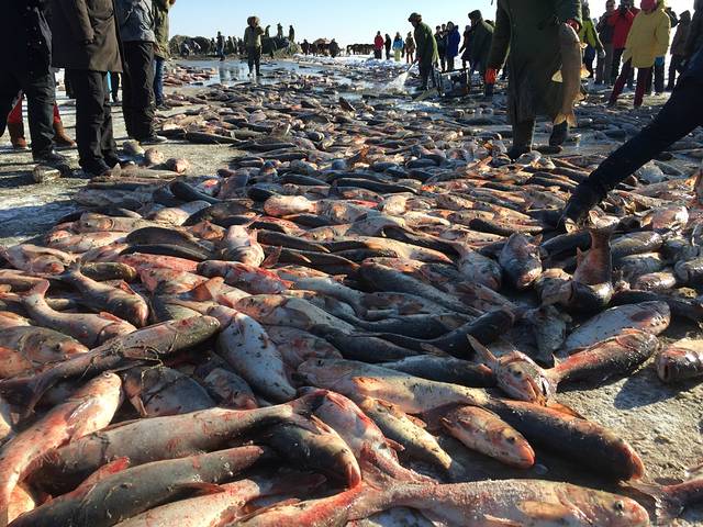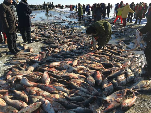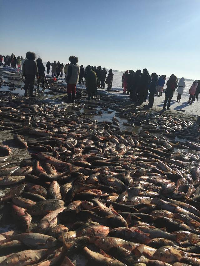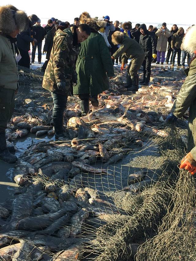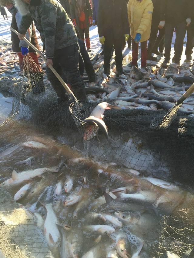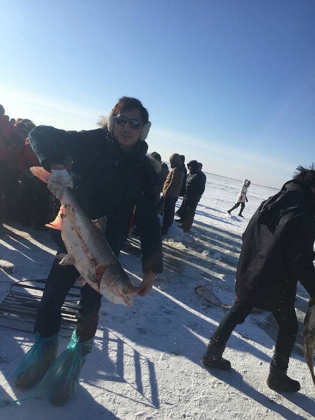 早就想去查干湖了,正好自己的公司成立了11周年,就开了三台车从沈阳出发,带大家去了,先说一下查干湖,查干湖每年从12月28日开始到第二年的3月8日这做期间每天在湖面上都有冬捕,查干湖分两个,一个大的是北湖,一个小的是南湖,大的是查干湖,大家去的时候最好都在北湖这个大湖看冬捕,一般拉起第一网的时候是上午11点多,最后一网拉起的时候是下午1点多,查干湖渔民管这个网叫拉,从第一拉好像能到第15拉,就是一共15网,大家算好到达的时候,刚开始的几网,都打不出来什么鱼,越到后面的网,里面的鱼特别多,所以刚开始拉出来的网,里面的鱼少的可怜,就不要一哄而上去抢那里面的鱼了,等后面的几网上来,满地都是鱼.