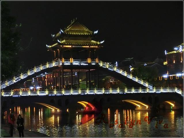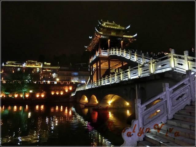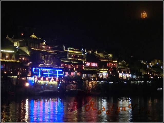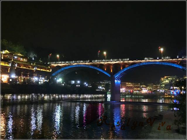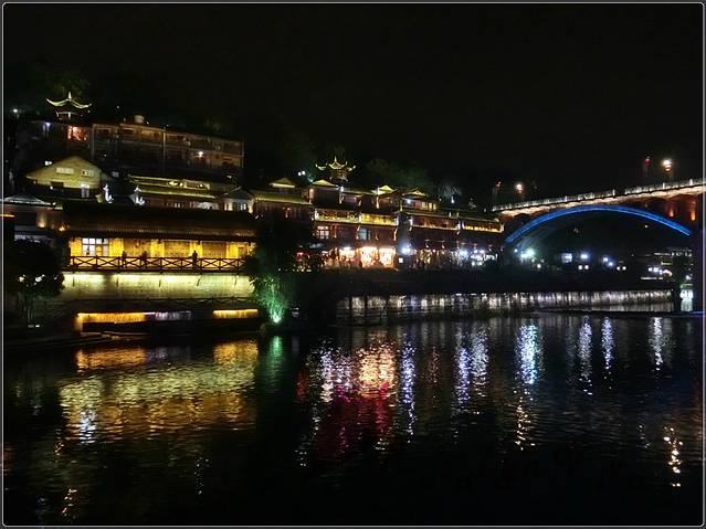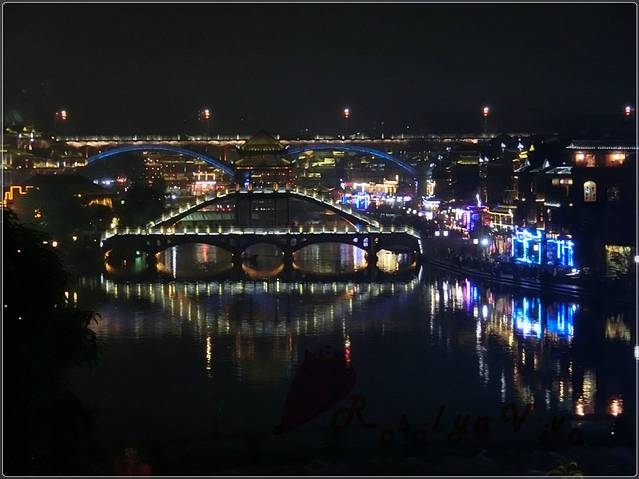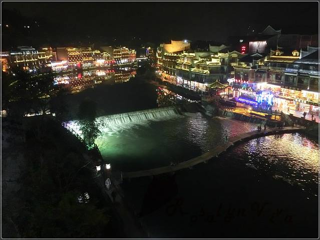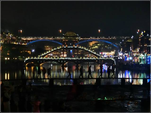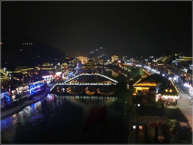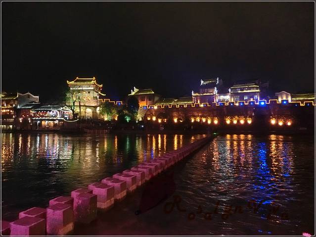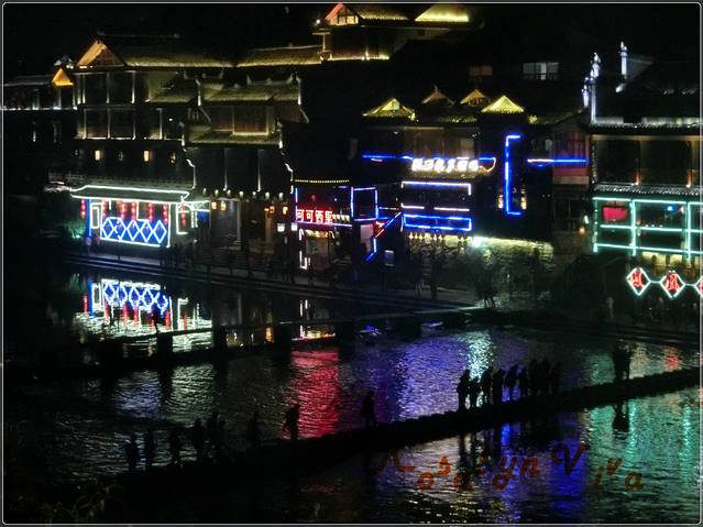 夜间跳岩,分割了一边的宁静和另一边的喧嚣,沿石一颗颗的走到对岸,便是热闹非凡传说中“我已等你千年”的艳遇之地——凤凰酒吧街。