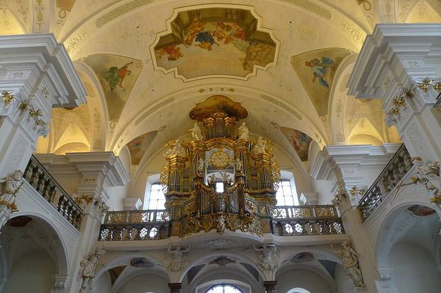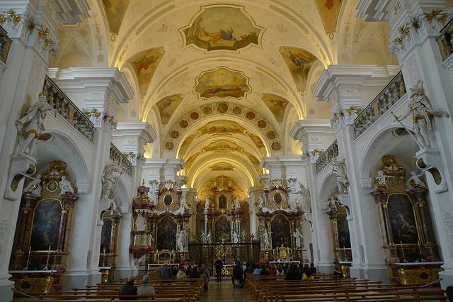 这座洛可可式的瑰宝有着极其奢华的内部装潢,先看一眼圣坛。