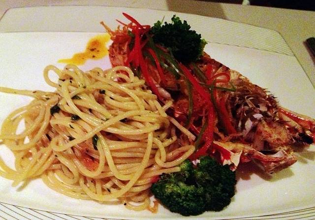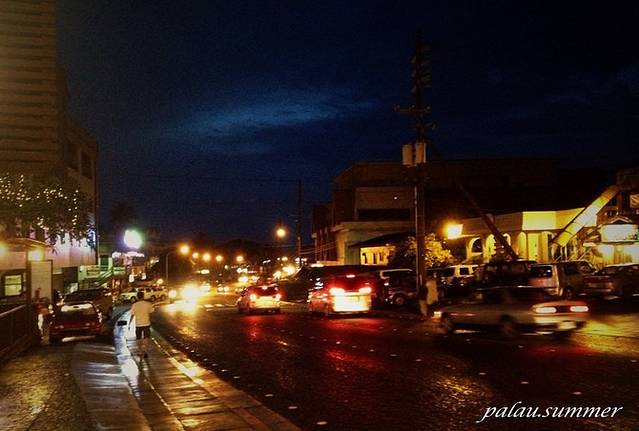 晚上,雨依旧在下,成群的游客在大厅等待餐厅的车来接去吃饭,帕劳的很多餐馆都负责接送,我们也被一家西餐厅的车接走了。