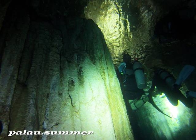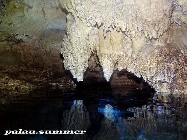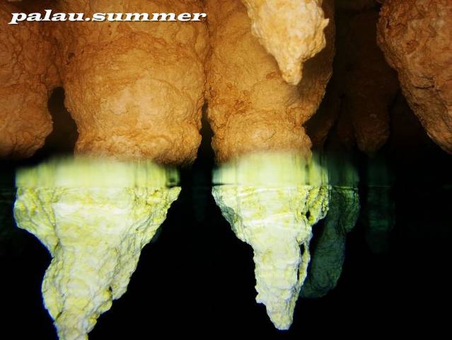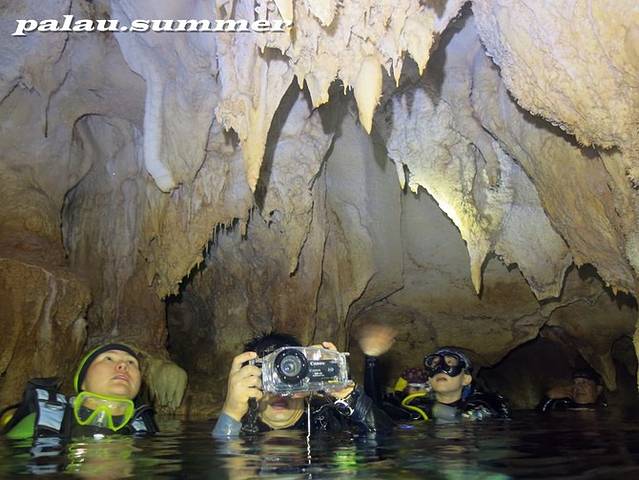 出了水面,先摘掉呼吸器,吸两口空气,在抬头欣赏悬垂的钟乳石。