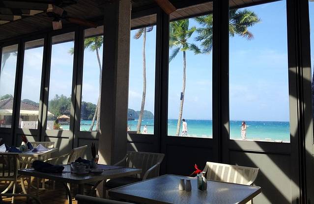 座位靠着窗户,能看到外边的泳池和沙滩。想着吃过饭可以去游泳,但只是刚刚冒个念头,天空就又开始下雨了,真是欺负人呀!不过被雨敲打的窗外风景依旧,并不因为雨的冲刷而逊色,反而更有种朦胧美。