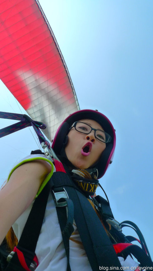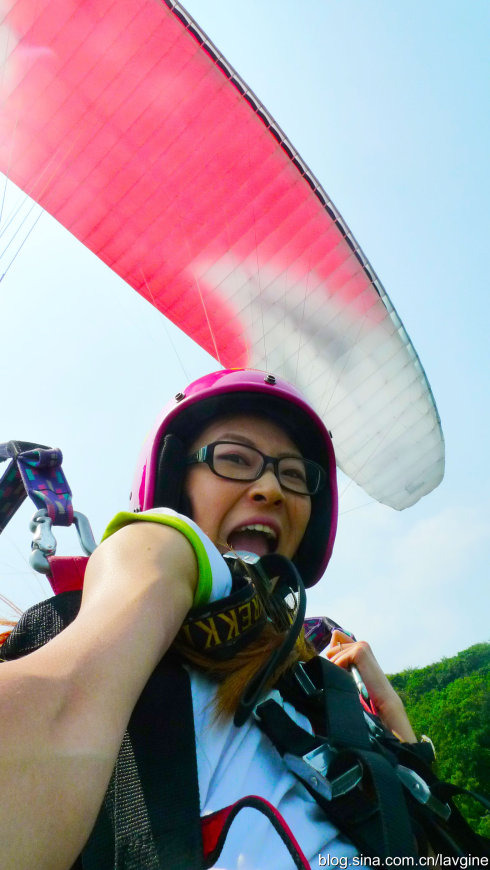 这批次飞行的游客不多,但是我又是第一个。。估计觉得我长得瘦体重轻吧。。教练在我后面绑好安全带,后面有大妈托着伞,一会努力助跑,就像跳楼一样,往下跳就可以了。