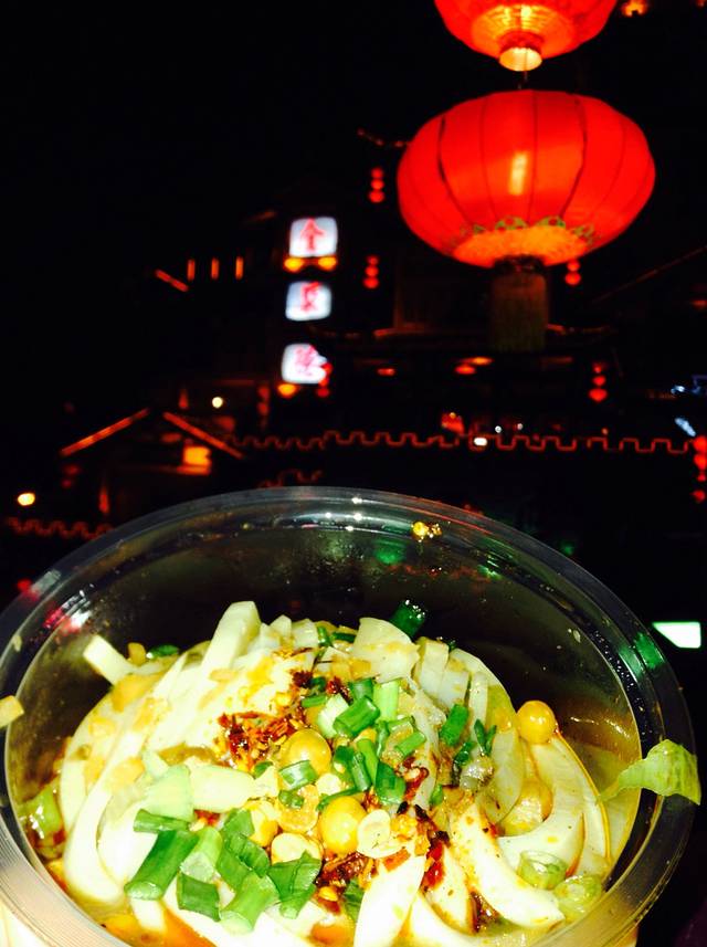 夜景挺美,在亭子里吃我们的【开心】凉粉