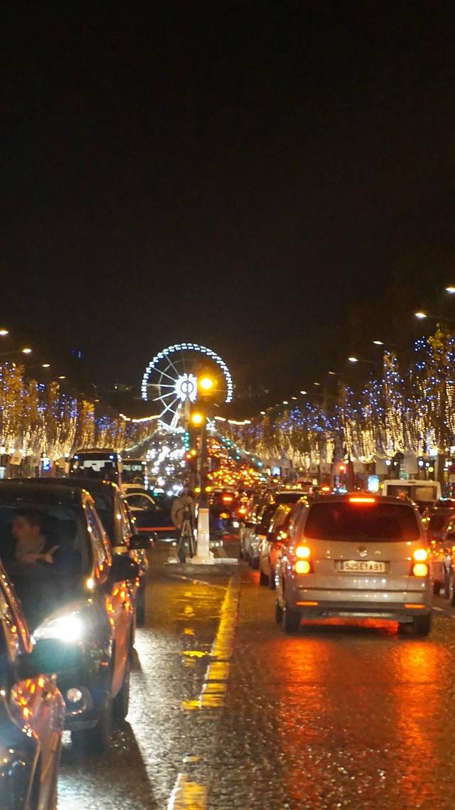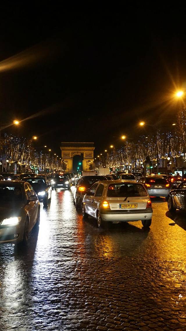 然后从高台上下来后,正好在右手边的一条路上看到了凯旋门。所以就沿着走去,顺便看了看香榭丽舍大街的夜景。我想说这人流,这堵车,跟咱大北京的下班晚高峰无异。