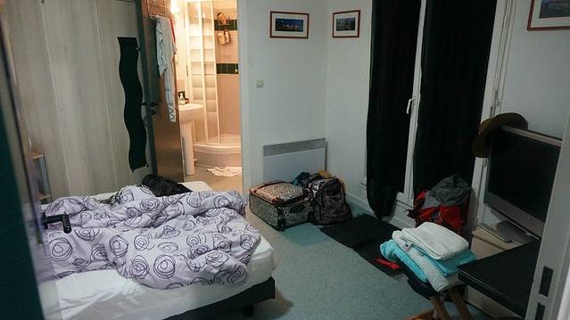 这个就是我们在AIRBNB上找的家庭旅馆。这间是卧室,配一个厕所。因为这是一个情侣住的地方,她们出去玩所以这段时间租给我们,所以所有的家庭用品都很齐全,还给我们留下了咖啡机。黑色窗帘布外边还有一个小阳台,可以抽烟,吃早餐啥的。但因为在巴黎的这几天都阴风大作,实在是没这个条件去利用好这个小阳台。