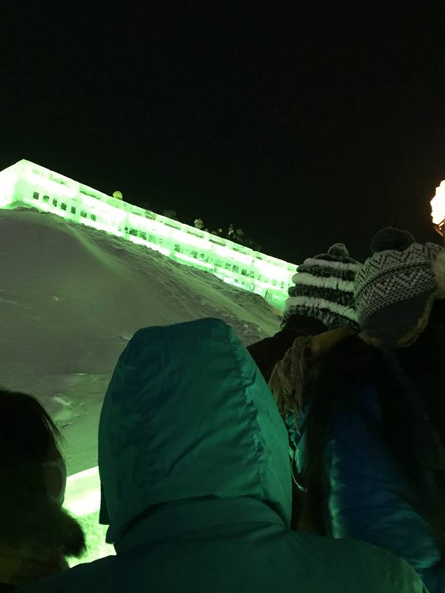 到了。先排队玩大滑梯,不然天太亮,冰灯也没什么看的。(室内表演同事说也很好看,有两场,大家可以把玩滑梯和看表演安排好)