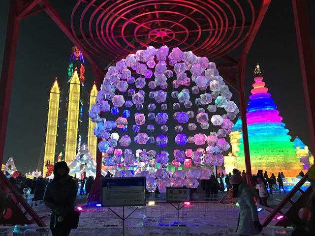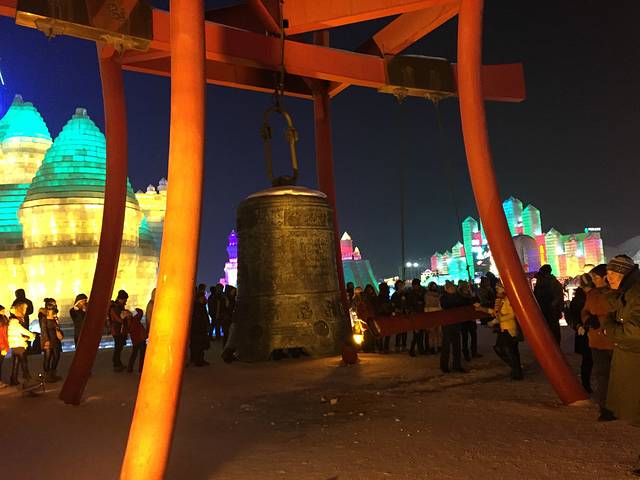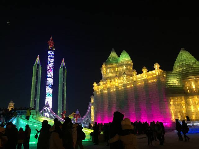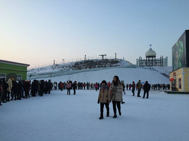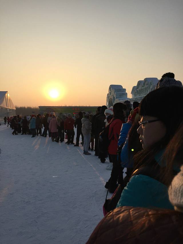 工作人员说要排五个小时,其实那么久,但从天亮排到天黑是真的,前面有人说,有这排队时间,都能回沈阳了。两个半小时后轮到我们了,屁股地下都有塑料板,滑梯很刺激,最后到尽头有一堆雪,撞到雪堆里。自己滑完,建议别走,在终点看看别人下来,都扎雪堆里啦。拍拍身上的雪,天也黑了,就正式看冰灯了。