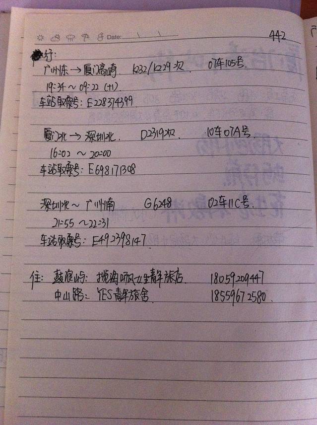 因为要上学的缘故,所以定在了星期五下午出发,出发去厦门的交通工具是火车,还是硬座....现在回想起来都有点害怕,坐了好久的火车啊,而且火车上卫生不是很好,坐了这一次火车之后,我以后没什么事都不想坐了...幸好回来的时候订的是高铁,呼呼...高铁就是爽,不过从厦门到广州的高铁是要在深圳转乘的,就是分开买票就好了,买票的时候注意转换的时间不要太长,不然就要在深圳站等好久的咯,通常转乘时间半个小时就足够了。