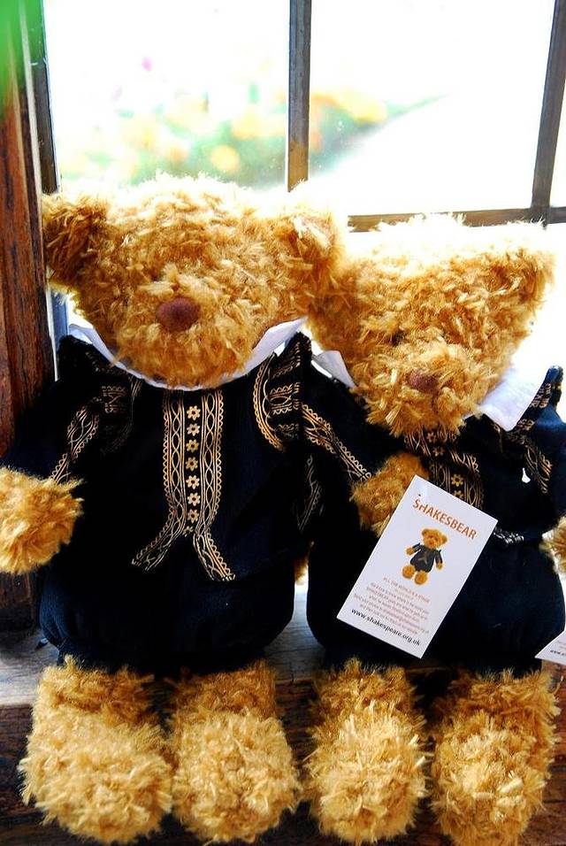 莎士比亚故居的内部装饰现在看来非常朴实,踏上楼梯还会发出吱吱的响声,在当时却是中产阶级人家才能负担的起的。现在故居中的每间房间都有志愿者为游客讲解。底楼沿街的那间屋子就是莎士比亚的父母制作手套的手工作坊,一位美丽优雅的年轻女士在那里给游客们讲解手套的种类和制作工艺,吸引了很多人驻足聆听。莎翁故居的后门是一个美丽的花园,正值八月,各种各样的植物和花卉在花园中争奇斗艳,显得格外美丽。在花园的出口处便是莎士比亚故居的礼品店,在那里有着各种各样和莎士比亚及其作品相关的纪念品出售。我却一眼被窗台上的莎翁小熊(Shakesbear)给吸引住了,这么有学识的小熊公仔自然要带一个回去,好让我沾沾大文豪的才气。