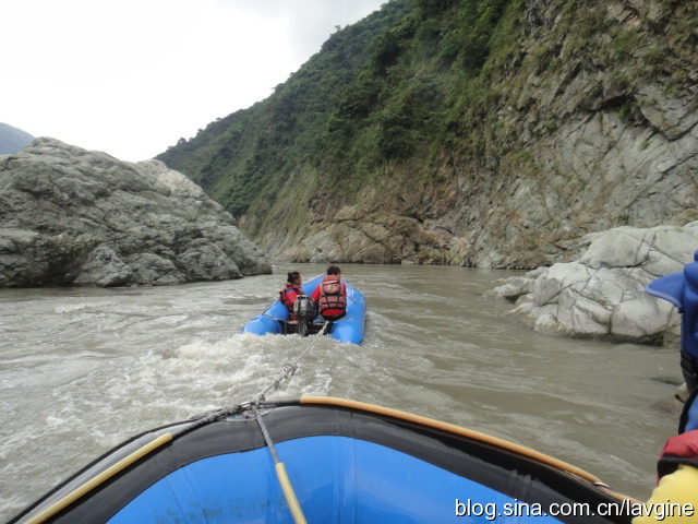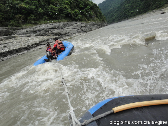 由于河水实在不急,船上的人又不争气,工作人员终于忍不住了,他们开着艘快艇,把绳子拴在我们的船上拉着我们走,速度一下快了不少;