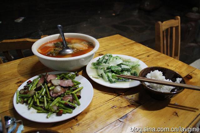 夜晚的西江下起了小雨,我们已经饥肠辘辘,狼狈不堪,决定先尝一下当地的酸汤,蒜台炒腊肉,酸汤的味道呢跟辣白菜汤的味道差不多,米饭没煮熟,硬邦邦的。现在是先以填饱肚子为主。