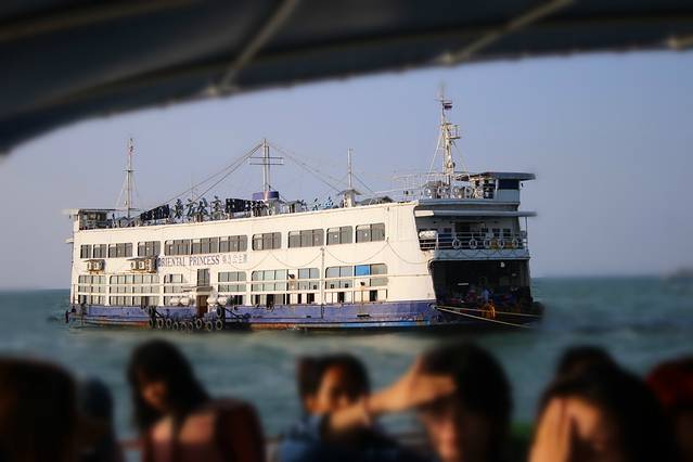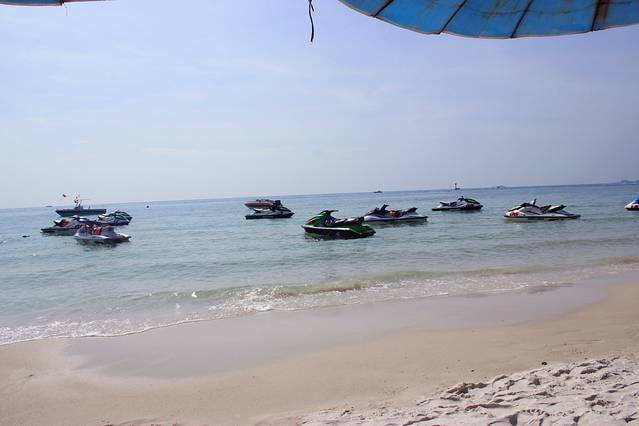 出酒店后的第一件事就是去租了一个名叫小黄的摩托车,好吧,名字是豆豆起的。有木有很俗。其实不仅是芭提雅,泰国整个国家都是一个摩托车横行的地方,如果说你不喜欢摩托车的方式,是可以享用泰国的双条车(有图)一个是20泰铢,整个芭提雅随便去。骑上了我们的小黄,奔驰在海滨路,穿过了步行街,到达码头,这里有特别多的船只都是去附近岛屿的,可兰岛去的人最多,我们也不例外。一个人应该是20泰铢,往返两个人是80泰铢。一个小时就到了,期间还看到了东方公主号!可兰岛是一个很漂亮的岛屿,码头把沙滩分成了两半,一半大,一半小,我们去了小的那边,因为人少。下来就是各种玩水...而我在玩沙子,不要问我为什么,我死也不会告诉你,我大姨妈来了。