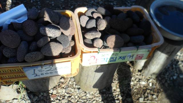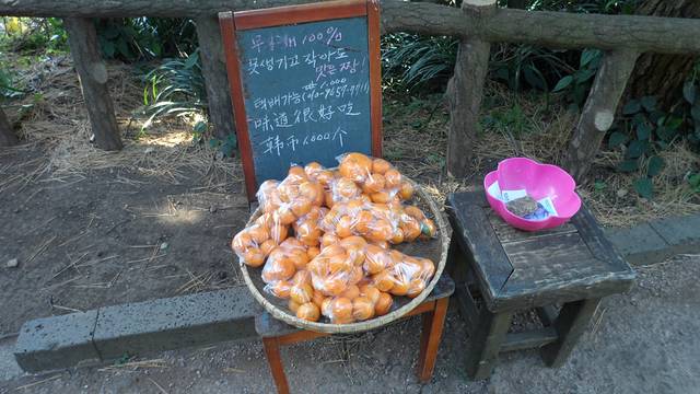 橘子是济州岛的特色,到处和橘子有关,独立岩卖橘子的摊点没有人看守,但是大家都自觉付了钱。