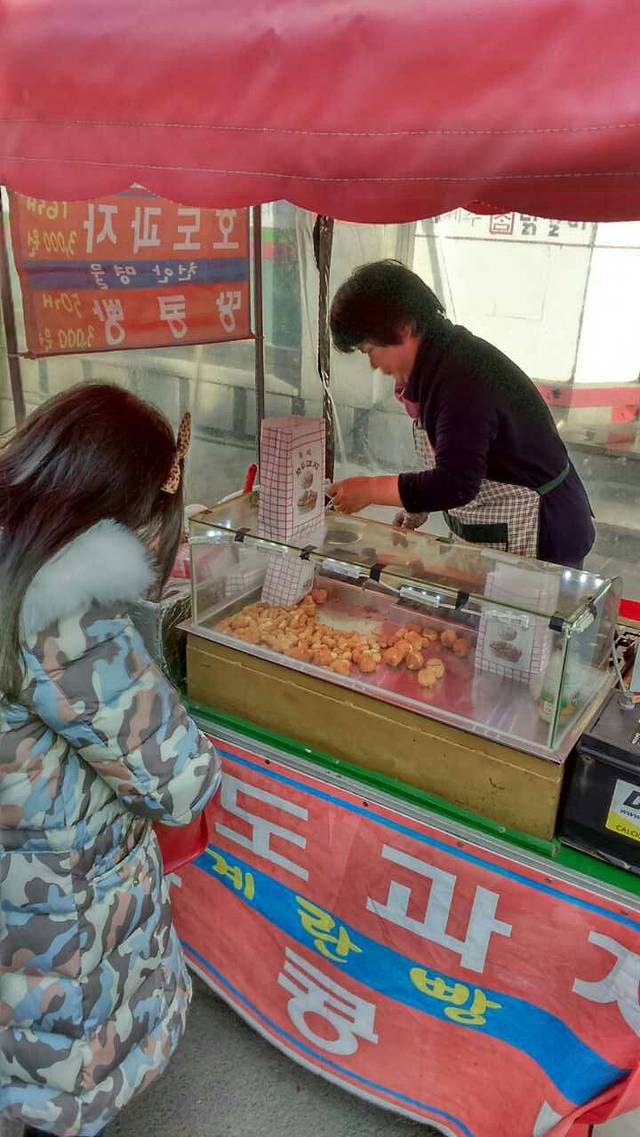 3000韩元半份,5000韩元一份,个人觉得在那里已经算很便宜了。小的好吃,里面有花生。莲洞步行街的小摊子。