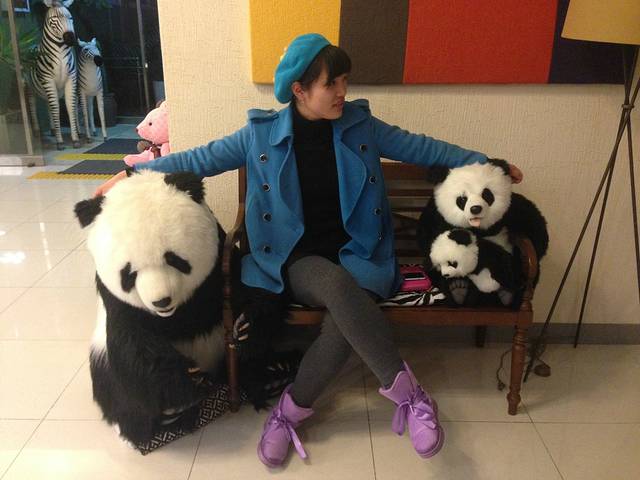 宾馆大门口有两只可爱的小斑马,大厅有几只可爱的小熊猫,忍不住合影个。