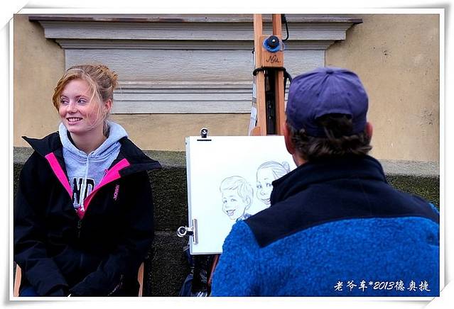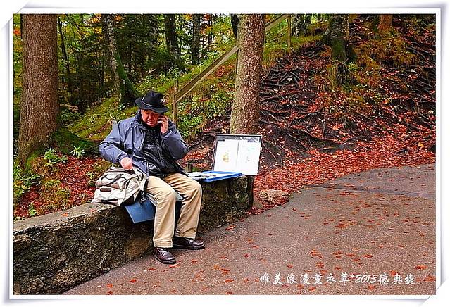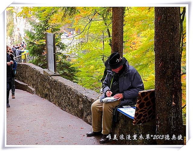 看见左上方桥上的人群了么?被树枝遮挡了,他们成为这个画家的一部分背景了。一张纸一只彩铅在他手里就像变魔术,只需轻轻勾勒,天鹅堡的美丽倩影便跃然纸上,此时,你会觉得手绘比照片更能体现新天鹅堡的气质。