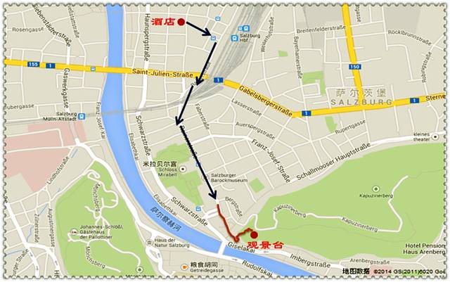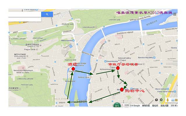 这是第一天下午至晚上行走示意图。我们沿着城堡区外围行走,这条路行人不多,景色很美,很是惬意。