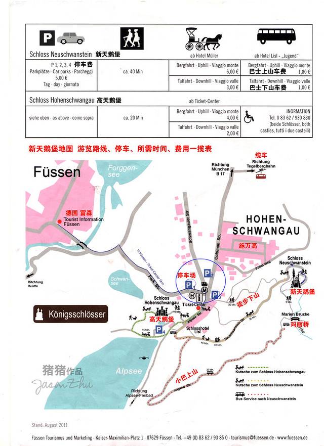 3、天鹅堡脚下---玛丽安桥,乘坐私营巴士上山,5分钟左右。票据弄丢了,记不清楚了。好像上山2.8欧/人,下山1.5欧/人。