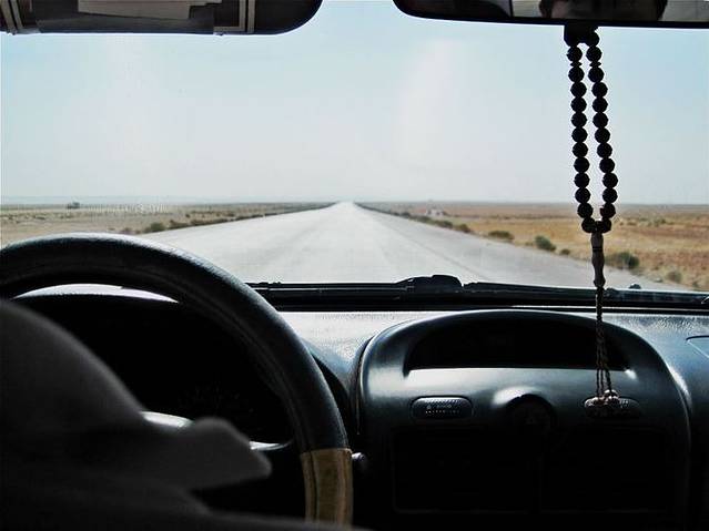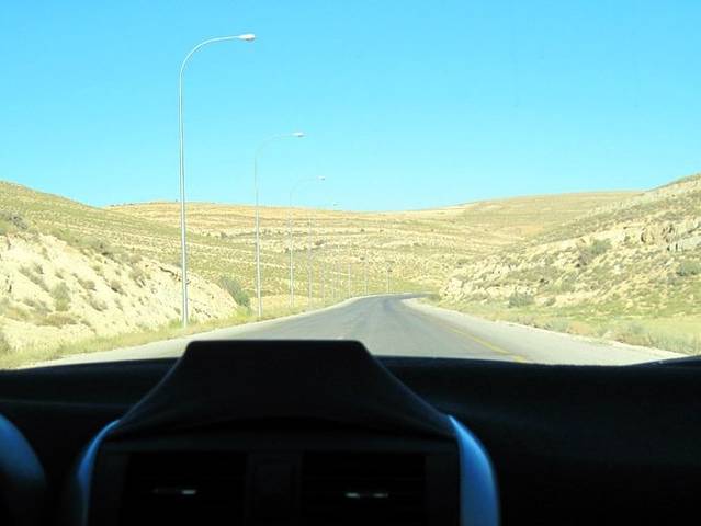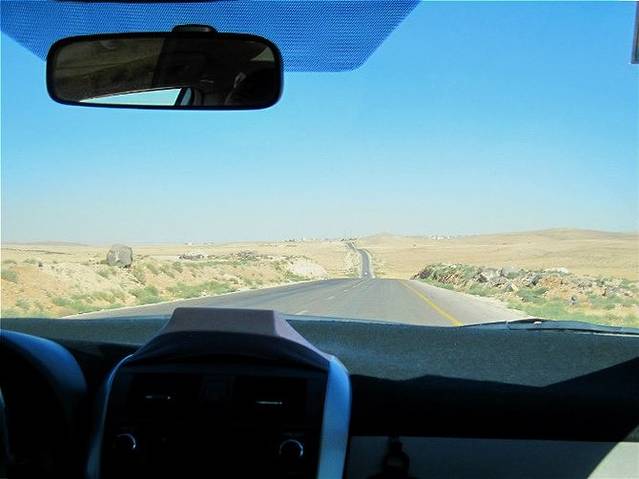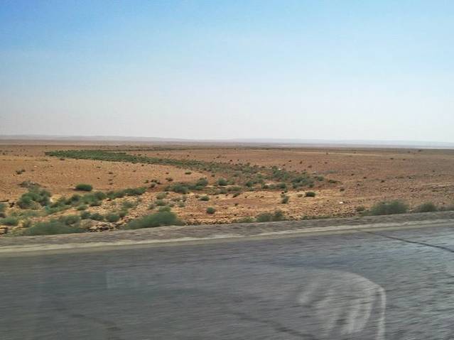 这位司机不吝啬空调钱,不像来的时候,一路都没有开空调,而是开车窗通风。从Karak到Petra,司机没有走回65号公路,而是改走15号公路,景色么,基本就是一望无际的沙漠、荒地,偶尔经过个城镇。路上也遇到军警检查,查的很细,包括司机的驾驶执照等文件,对我们倒是没怎么盘问,只微笑着说了一句welcome to Jordan