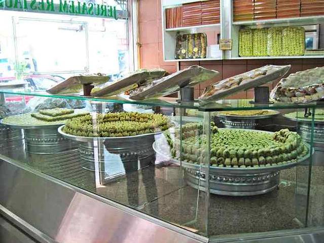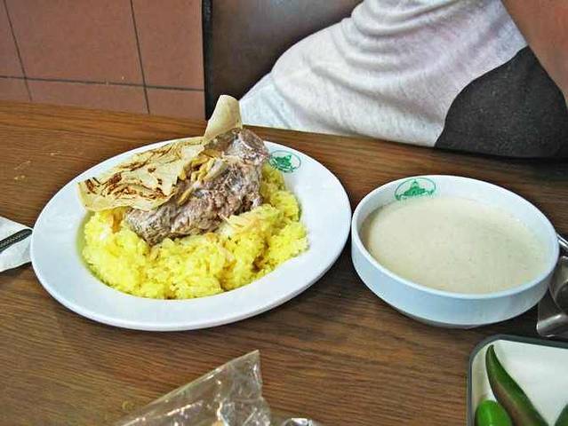 老板推荐的和很多旅游手册上推荐的一致,是一家叫做Jerusalem的饭馆,也叫Al Quad,距离hotel步行10分钟距离,出门走到King Talal大街上,往Hussein清真寺方向走,到清真寺前一个路口(西联汇款)右转,到Shaaban大街,沿这条街走马路右边就能看到。这家店门口摆的都是甜品,很多路人买了带走的,走进大厅内可以堂食,有正餐的菜单(英文的)。这里比较著名的是mansaf,菜单上写着"National Food",旅伴到约旦以后就一直想吃,点了一份,酸乳酪羊排配米饭,后来证明如我在攻略信息中看到的,不适合中国人口味,好在乳酪和羊排饭是分开上的,乳酪吃不惯,羊排还是可以吃的。我只点了一份常规的烤鸡肉、蔬菜配米饭,一杯mango汁,几块baklava点心,一共7JD,不便宜