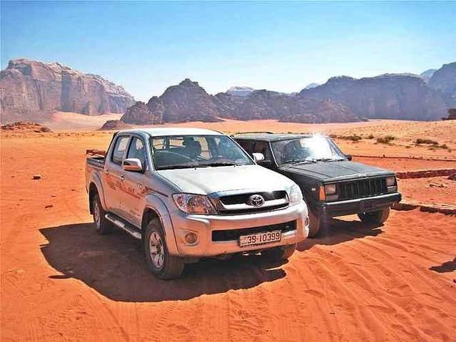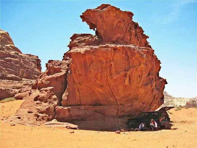 看完两处拱门之后,就往回开了,司机看四下无人,就猛地踩油门开了一阵快车,在沙漠里这样开车的确很有意思。和Mehedi说的时间一致,在下午2点准时回到村镇,车子停在我们来时的茶棚旁,Mehedi已经回家了,司机就帮我们取下行李,再找去aqaba的出租车,事先和Mehedi说好帮我们找的。茶棚里有人告诉我们的司机说出租车已经来了,在旁边的停车场,到了停车场果然看到一辆绿色的喷涂有aqaba标志的taxi在等我们了。于是给吉普司机付了60JD tour的费用后道别