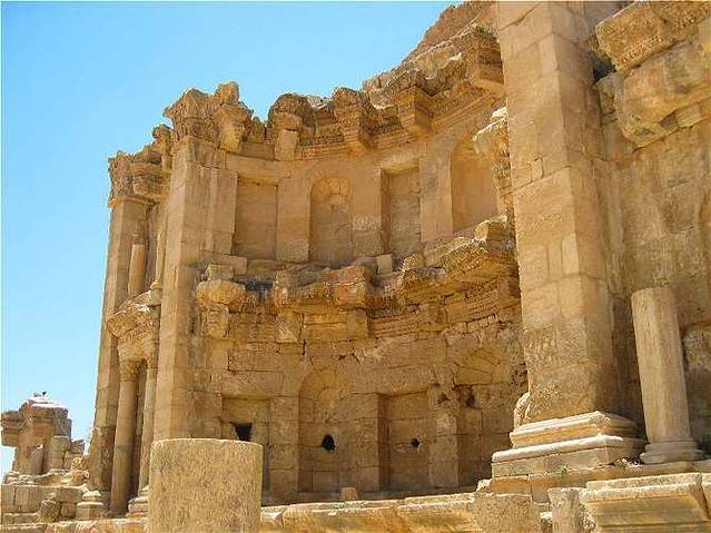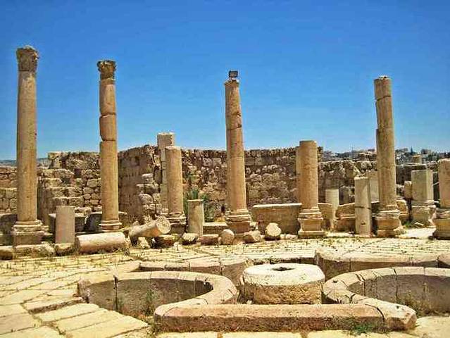 Jerash在希腊、罗马时代的古城其实叫Gerasa,文献记载是公元前331年左右,亚历山大远征到这里(离开埃及前往美索不达米亚途中)建立了此城(但考古发现这里从公元前3000年左右已经有人定居了),到公元前63年罗马占领后,成为罗马的叙利亚行省的一部分,90 AD后又被吸收进阿拉伯行省。在罗马时代,这里一直很和平安宁,所以人们可以集中精力发展经济,建筑也大量增加。当时城内有钱人很多,他们出资修建了大部分建筑。这座城市也曾诞生众多杰出的人士,如数学家尼科马霍斯(Nicomachus of Gerase)。到公元1世纪后半期,Jerash城达到繁荣顶峰,公元106年Trajan皇帝修了公路通向Jerash,促进了这里的贸易,129-130 AD期间,Hadrian皇帝到这里访问,那时Gerasa已有80万平方米面积。不过,614 AD波斯的入侵使杰拉什有些衰落,但直到阿拉伯倭玛亚时代仍相当繁荣,是749年的地震毁掉了古城的很大部分,后来的地震和战争等,又进一步加剧了损毁,使得古城逐渐被遗弃。到1806年,德国的考古队首先发现了被泥土掩埋的古城,才开始发掘,到今天就成了中东地区保存最完整的罗马古城之一