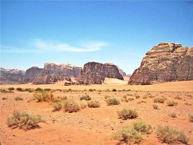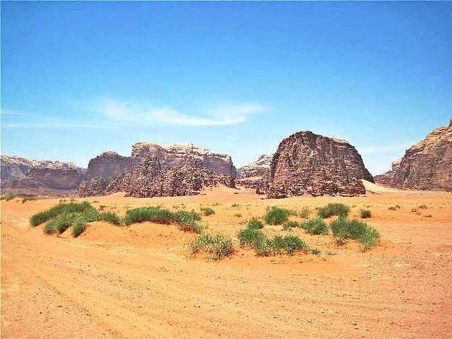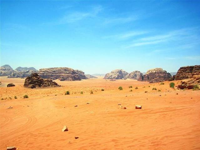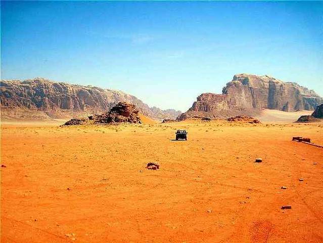 等介绍完jeep路线,我和旅伴的司机就来了,一位穿着白袍戴着头巾的阿拉伯年轻人。就带上行李随司机出发,行李也可以寄存在这家餐馆,但还是带到吉普车上更让人放心。不过吉普车后备箱中已经被中午做饭用的原料占了一半了,这顿饭也是包括在tour费用里的。车子是切诺基4×4,看来很旧了,估计也是使用过于频繁,但安全就没问题。刚好9点,天气还不热,我为了防止暴晒穿了长裤,也还不觉得热呢,坐在车里也不需要空调,开车窗就可以了。开车出发,穿过小镇,就没有公路了,开进了wadi rum的沙漠之中