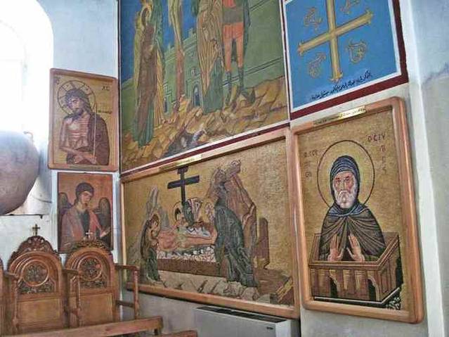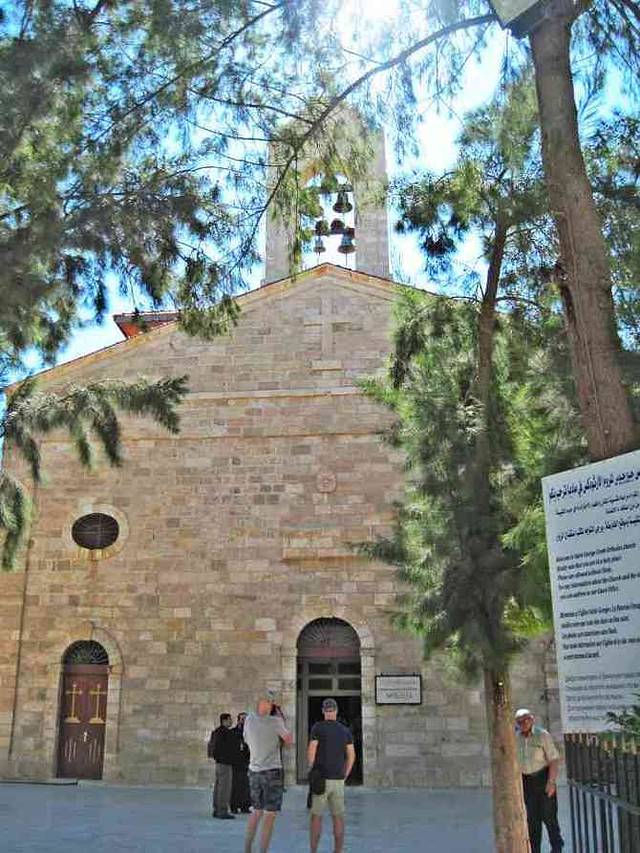 司机把车开进Madaba镇子里,停在St George教堂门口的路边,这座希腊东正教教堂也是整个Madaba最著名、访客最多的景点,因为著名的holy land圣地地图。进院门的时候就看到很多荷枪实弹的军警,其实镇子里很多地方都有这样的军警站岗,或许是因为游客太多,要重点保护吧。游客除了散客,还有一批接一批的旅行团,由旅游大巴载来