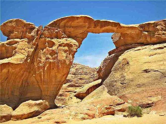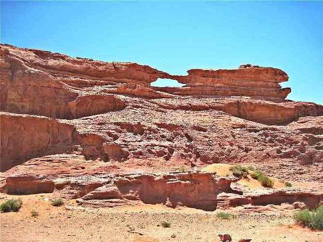回village之前,还有一处景点是Um Frouth Arch,其实景区里有很多大大小小的拱门、天然桥,但时间有限,只能去一个了。到了拱门底下,司机把车停下就打算到一边抽烟去,留时间给我们爬上arch,如果是上午或者傍晚凉爽的时候我可能会爬,可这正午太阳正毒的时候,我是无论如何都不想爬了,只在拱门下拍照留念一下,旅伴根本就没下车。这里的arch比起在美国西南部见到的,尺寸小很多。于是司机也没来得及抽烟,就被拉回车里继续开车。后来又到了附近的另一处arch,更小了,依然没兴趣爬