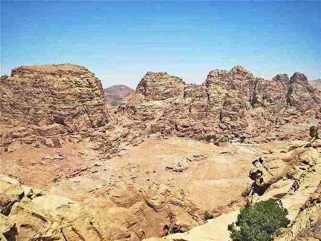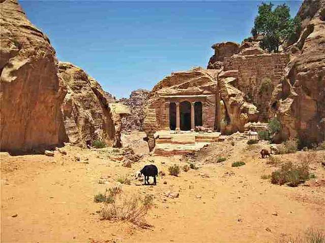 就在我们沿着明显的步道走的时候,又看到旅伴前一日那个阿拉伯导游从山坡上骑着驴下来,看来他这半天都没拉到生意。他很远看到我们,就提示我们方向错了,要沿小路到他所在那个山坡上,翻过山坡到basin,这就很奇怪,因为我们是沿着明显的一条footpath在走的,不过他说的方向也不错,可能是一条近路吧,正好这里还有个本地阿拉伯大叔在放羊(其实这一路也看到不少羊了,和驴、马、骆驼凑在一起,佩特拉可以开动物园了),问了这个大叔,也说是上山坡的路,于是就改道跨过山坡往basin方向走。后来查地图,我觉得沿着主路走应该是到罗马街西侧Umm Al-Beyyara山丘脚下的一组unfinished tombs