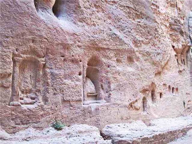 逐渐看到越来越多的陵寝遗址,有些是把门面部分修复过的,有些保留着风化后的样子。这些tombs大部分时间接近,大概是公元前1、2世纪到公元后1、2世纪这段时期的,所以看到大致风格也接近,例如都是方形的门面,但仔细看,也能看出风格的混杂,雕凿细部,有原初的受埃及影响的纳巴特风格,也有后来希腊、罗马风格的改造。因这些tomb的集中,这条路也叫"facade street",沿途有很多文字说明牌,这方面比杰拉什好很多。从这些遗迹,可以看到佩特拉地区独特的岩石,表面有美丽的波浪条纹,是风力、水力长期侵蚀的结果,很像是美国西南部antelope canyon一带