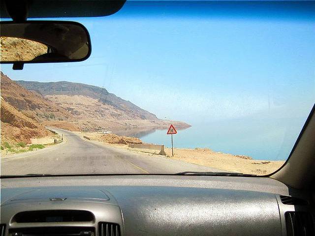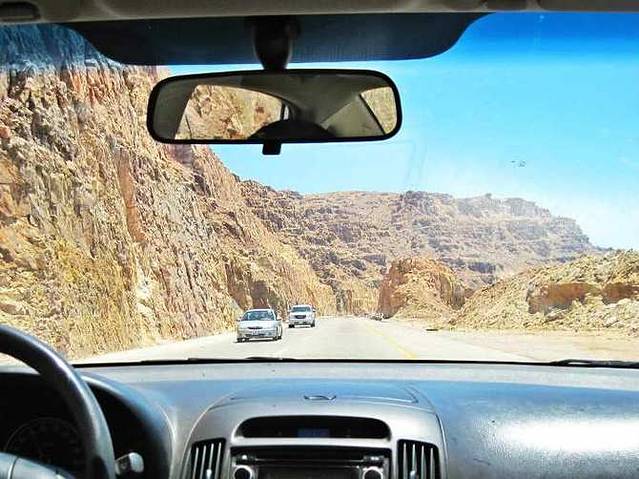 我吃完饭,旅伴也漂浮完换好衣服了,于是叫上司机出发,下午1点左右,正是天热的时候,车子被晒得很烫,刚开车门都不敢坐进去。往南行驶,开上了65号高速路,也就是5000年历史的King's Highway,国王高速路,最早是罗马人在Trajan皇帝时期修建的中东商路网的一部分,如今平整宽阔的公路从亚喀巴到伊尔比德,联通约旦南北端。从Amman beach出来,路上很长一段先是在死海边开,风景不错,还能看到平静的水面上山丘的倒影