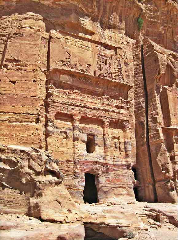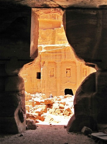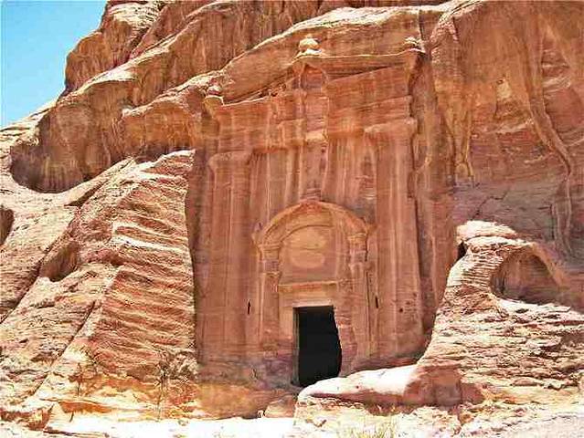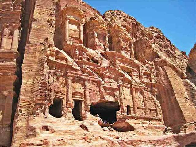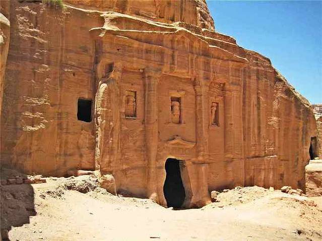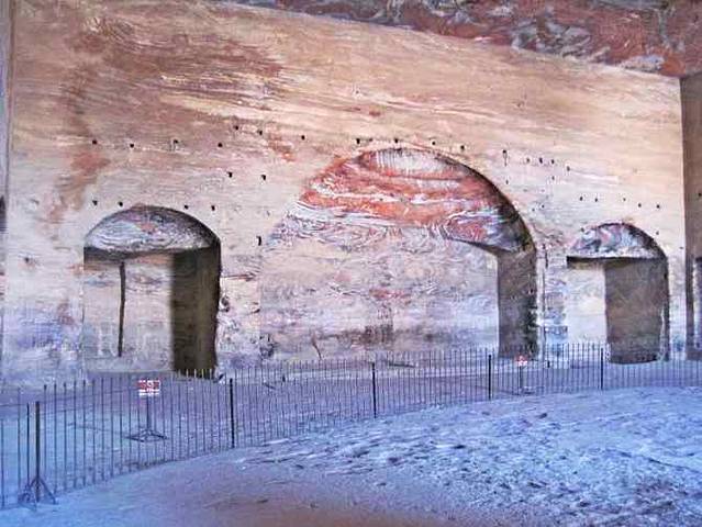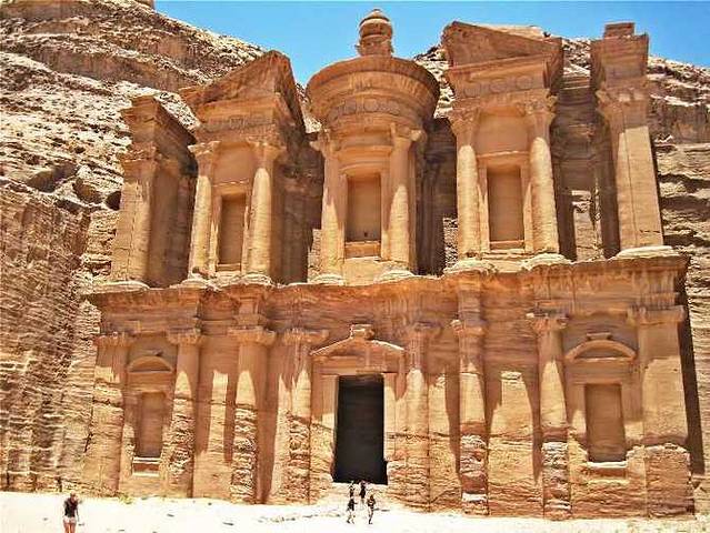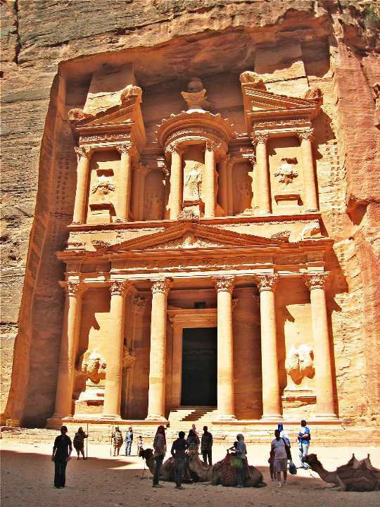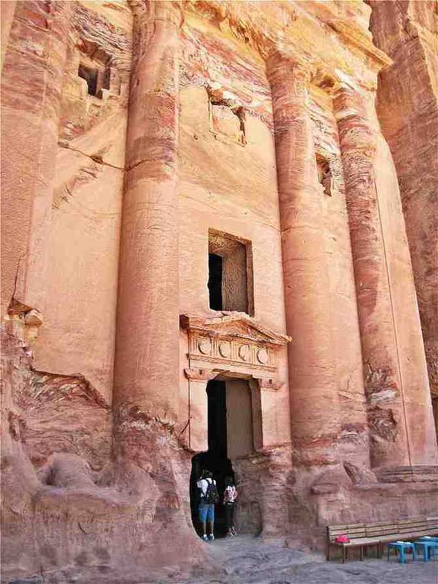 和其它很多佩特拉的遗迹一样,这treasury也是在砂岩中雕凿出来的,据说是公元1世纪,佩特拉的Aretas IV Philopatris统治期间建造的陵墓。之所以叫做treasury,是因为传说正面二层的瓮形结构中藏着纳巴特国王的宝藏;也有人认为这个宫殿在摩西时代曾为埃及法老藏宝所用。不管怎样,当地的贝都因人已经彻底探寻过了,二层可能“藏宝”的石瓮上有贝都因人留下的子弹痕,但显然这只是一块实心的大石块而已。神殿正面是古典希腊风格,经过两千年的风雨,早已风化,今天所见到的相对整齐的外观,是近年维修的结果,原本石柱之间还有纳巴特神灵的雕像,但早已严重损毁无法辨识,即使维修,也不可能凭空想像,只能模糊留出身体的结构来