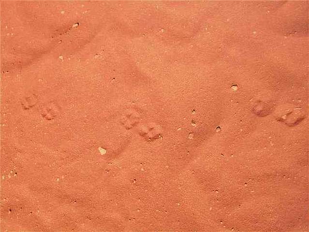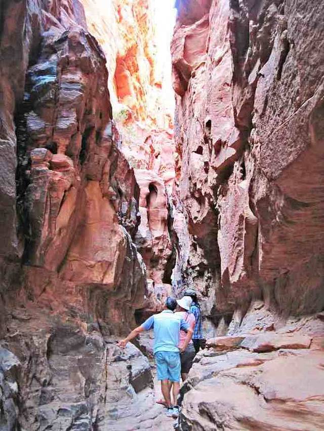 离开劳伦斯泉,又开到第二个景点,Khaz'ali峡谷,这是两块大岩石之间一道极窄的狭缝,贝都因人习惯在这里乘凉避暑,岩石壁上也有很多inscription,有象形文字,也有晚近一些的伊斯兰文字。另外这峡谷里还有水井的遗迹,并且还真的有水。我们和另一组游客、导游一起走进峡谷,人家的导游在认真讲解,我们的导游自己玩,竟然三窜两跳攀到崖壁上层去了!在进峡谷的时候,看到沙土地上有小动物的脚印,我们的司机夜里这里有很多动物