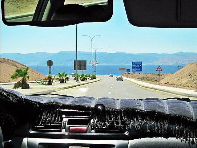 旅伴并不和我在Aqaba住宿,晚上在城里坐JETT回amman,第二天清早的航班飞去黎巴嫩,我在aqaba住一晚,第二天下午返回安曼。而旅伴还想先看看红海,我就在上车的时候就和司机大叔说先送旅伴到海滩,再送我到酒店,我给司机看我酒店的地图,又指给他地图上标着的就在我住的酒店旁边的海滩,其实就是Aqaba市中心的海滩。说了很多遍beach/marina,不知道司机是真不懂还是装不懂,还是在到了aqaba之后往南开,把我们带到了south beach一带。亚喀巴有两个大的海滩,一个是市中心海滩,一个是south beach,前者主要是给本地人开放的,后者是度假区,给外国人的,很多高档酒店也在south beach(市中心beach也有高档酒店,但少一些)。司机竟然把车停在beach附近的一家叫marina×××的酒店门口,说是已经到了,我只好再给他看地图,再连着说了几遍beach,他似乎才明白,于是调车头,把旅伴放到south beach的公共beach,旅伴提了行李下车,司机还跟下去给了名片,说是需要回城里的时候可以给他打电话。因为说好我付钱,司机在这里就没找旅伴收费