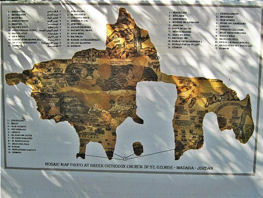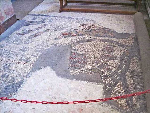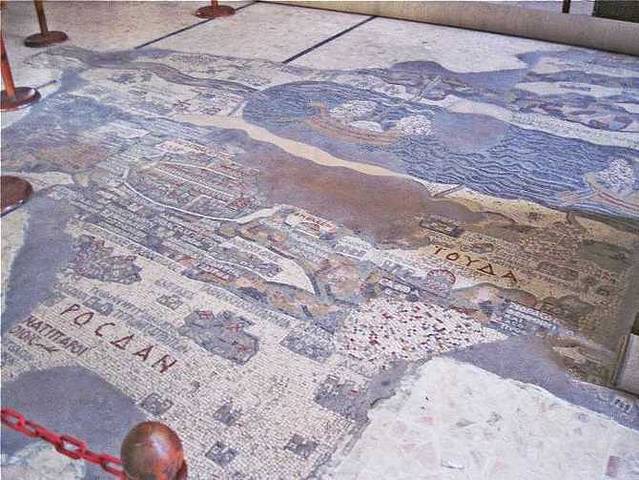 走进教堂,有人检票,教堂其实很小,最主要的景点圣地地图就在大厅地板上,周围围起锁链表示禁止走上去。地图是6世纪时制作的,当初由200万块各色碎石拼成,面积21*7米(如今只有16*5平方米),描绘了中东地区的地形,最北到黎巴嫩,最南到尼罗河三角洲,最西到地中海,最东到沙漠地区。地图并非如今天的惯例上北下南,而是按照与实际相符的东南西北做在地板上的。