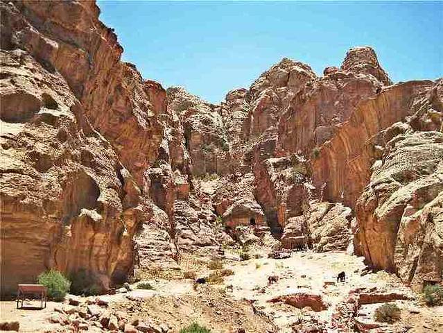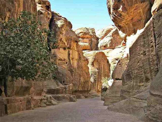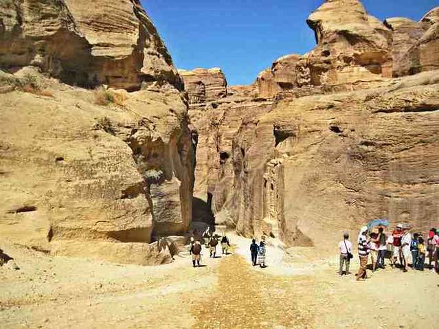 到Siq通道入口,马就不能通行了,这里右手边有个已经干枯的水渠,从公元前1世纪起就曾在这里修坝,今天可以见到的坝是20世纪中后期重修的,目的始终是同样的,控制洪水季节从山中冲出的水流不要灌进Siq通道里。这里也是一条trail的入口,可以到景区内的royal tombs,但道路崎岖难行,一般要有向导带着才能走,所以很少有游客从这里进景区,大多还是走siq