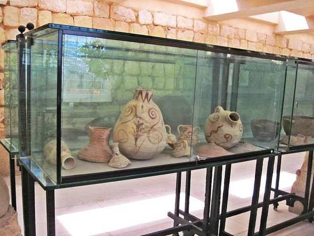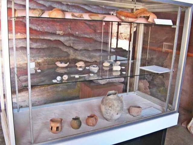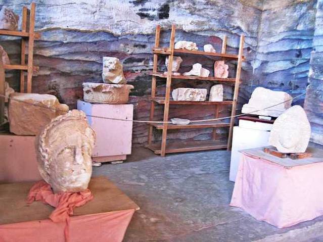 在下午1点左右走完了这条trail,到了basin的餐馆,起初在旁边的树荫下休息,后来旅伴和日本MM发现餐馆有一半室外的座位没有人坐,都在凉棚之下,于是就坐过去,餐馆伙计也并不介意。在这里一边休息一边吃从hotel带来的大饼。休息过后,就到山丘上的museum看了一下,这个博物馆相对于佩特拉的规模,实在是太小了,房屋很简陋,就是岩石洞穴改造的两间小屋,收藏的文物也不多,从博物馆门前俯瞰罗马街和远处的royal tombs,视野还是不错的。在这里还遇到走错路的华人游客,以为是到Deir修道院的路