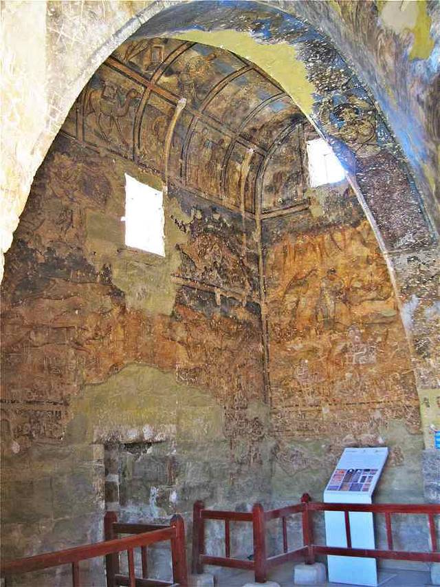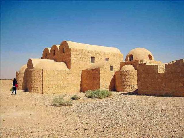大概1个半小时,我远远就看到沙漠中的Qasr Amra城堡了,因为周围完全没有其它任何建筑。Amra城堡是8世纪早期建筑,据说是Walid II修建的,他后来在倭玛亚王朝的国都大马士革成为国王(哈里发),但他在成为国王之前,是在沙漠里长期休假玩乐的,例如狩猎、奏乐、或者吟诗,这个城堡就是在他成为国王之前修建的,作为狩猎期间休息、休闲的别墅。实际上这里原初是个建筑群,比目前所见的仅剩下的一个小城堡要大很多,仅剩的小建筑是由石灰石和玄武岩垒建的,顶棚是多重拱形结构,以及dome,代表了早期伊斯兰建筑风格