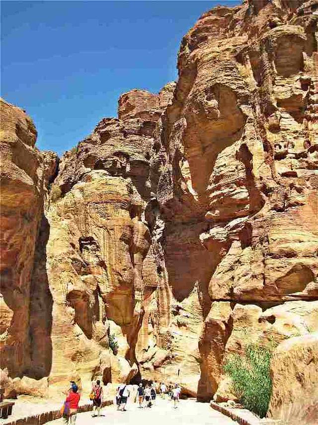 Siq通道是Petra中神奇的所在,夹在两侧高达180多米的悬崖峭壁之间的这条狭窄通道,本是由风和水的自然侵蚀而生成,在纳巴特人时代就是Petra的重要设防地点。这里充分体现了“一夫当关万夫莫开”这句成语的含义,现代用于游客,纳巴特时代用于商旅,入侵的敌军是很难攻破这里的(不过南方和北方的通道也留下了多次被侵略的迹象)。所以在Siq道入口的地方,有人扮作纳巴特或罗马士兵的模样举着盾牌和投枪站岗,游客有不少合影的,但会被索要donation,他们在路边放了个小盒子,宣称是为维护古迹募捐,可这笔费用难道不该从门票中支付么?!