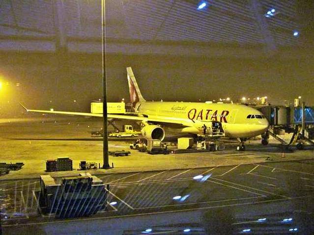 到了gate,看到飞机正在装货,地勤已在柜台但还没有允许乘客登机,朝鲜的那个运动队看来很疲倦,大多人都躺倒在长椅上睡觉。等了20多分钟,就开始登机,基本坐满,绝大部分是中国乘客(但并没有见到劳务输出的农民工),不过空乘却只见有一个中国人,机上广播也没有中文。准时起飞,到多哈飞行时间大约8小时,刚上飞机不久以及即将到多哈的时候,各发了一顿正餐,感觉比土航的航餐质量差不少,品种就少。大多乘客都在睡觉,不睡觉的,座椅背有小屏幕,有免费的电影、游戏等,内容还不少,并且有多种语言选择,朝鲜队的队员竟然也都选择看韩剧!