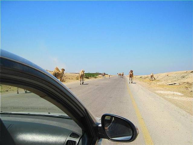 用了不到20分钟,Nebo山景点就逛完了,于是开车继续赶路,一路下山,就逐渐看到越来越清晰的死海,路上还偶遇一群骆驼,也没人照看,就在路上大摇大摆地走,车子要减速绕过它们。