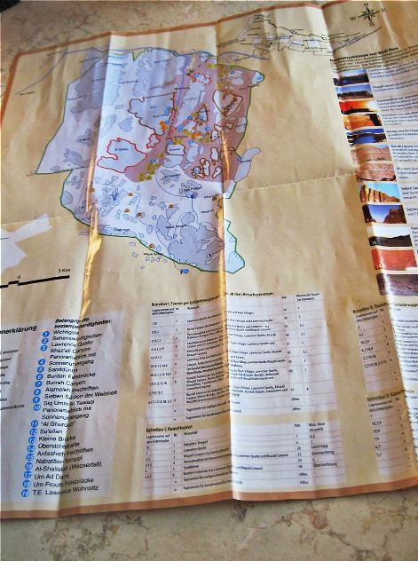 从visitor center再往景区里开,到贝都因人的村庄,目前在这里居住的几百贝都因人99%都是从事wadi rum旅游行业的,或者是tour组织者,或者是司机、导游、开餐馆和纪念品店的商贩。到村子边界,司机停在路边站立的一位阿拉伯中年人身旁,和我说这就是Mehedi,我们预定的tour组织人,于是我们也赶快提了行李下车了。和Mehedi打过招呼,他就带我们到路边的一处餐厅兼茶棚等候,这里也有洗手间。原来他只是组织人,并非jeep司机,要等着司机前来。他还有另一位客人比我们早到了,一位英国女士,独自旅行的,预定了露营2天的tour,白天也要坐jeep兜风。这里的tour很少把散客拼团,而是都组织private tour,所以她也要等另一位司机。道理上说司机也兼导游,但其实我们的司机讲解的很少,也许是英文不是很好,另外这些自然景观本来也没什么太多可讲吧。等司机的时候Mehedi指着地图给我们介绍了jeep路线,我们的短,英国妇女的更长
