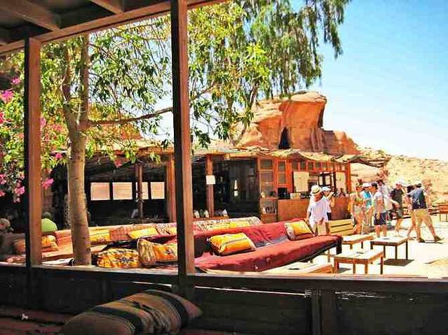 到了Deir修道院门口,也有一处cafe,生意很火,除了卖饮料,还卖三明治(有简易的加热装置),我早已饥肠辘辘,就花3JD买了个cheese sandwich,3JD买了杯果汁(点的是鲜榨橙汁,却给我一杯绿色的饮品,可能是柠檬一类的水果,是早已榨好的一大杯放在冰箱里,有人买就倒出一小杯来),就到凉棚边吃喝边休息,除了凉棚,这里还在洞穴内安置了板凳,也有室外露天的坐席,但太阳晒着,没有人到露天坐着。凉棚和洞穴中的毛毯软软的,实际上可以躺下睡觉的
